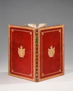 1808 Un volume, in-folio, de : frontispice, [2] ff., IX pp., [1] p. bl., (2) ff., 9 pp., 15 planches hors texte, pleine reliure de l'époque en maroquin rouge. Dos lisse très orné portant le titre doré sur une pièce de maroquin vert, large guirlande dorée autour des plats portant en leur centre les armes dorées de l'Empereur Napoléon Ier. Roulette dorée sur les coupes, tranches dorées. Frottements légers sur les coiffes et les coins.