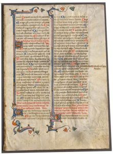 ENLUMINURE. UN FEUILLET ENLUMINÉ. MANUSCRIT DU XIIIe siècle. Une feuille de parchemin 35 x 24,5 cm manuscrite, décorée, enluminée recto verso.