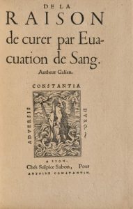 GALIEN (Claude). DE LA RAISON DE CURER PAR ÉVACUATION DE SANG. A LYON, CHÉS SULPICE SABON, POUR ANTOINE CONSTANTIN, s. d. (1542 ?). Un volume, in-8, (165 x 110 mm) de, titre avec marque typographique de Sulpice Sabon, collation A - D8 : 32 ff., paginés 1 - 63, soit 64 pp., contenu : A1r titre, A2 r De la raison..., D4r Petits traictes propres à la médecine, D5v De revulsion, D6v Des ventouses, D7v De scarification, D8v Sapidus etc. Pleine reliure en maroquin bleu. Dos à 5 nerfs portant le titre doré, filets dorés sur les coupes, dentelle intérieure dorée, monogramme doré sur le premier plat. Reliure légèrement frottée sur un mors, petite tache claire sur le premier plat.