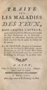 GUERIN. TRAITÉ SUR LES MALADIES DES YEUX, dans lequel l'auteur, après avoir exposé les différentes méthodes de faire l'opération de la Cataracte, propose un instrument nouveau qui fixe l'oeil tout à la fois & opère la section de la cornée. LYON, REGUILLIAT, 1769. Un volume, in-12, de XVI pp., 445 pp., (7) pp., pleine reliure de l'époque en basane marbrée. Dos lisse très orné et doré portant une pièce de titre en maroquin vieux rouge, filet doré sur les coupes, tranches jaspées. Seulement quelques cernes de mouillure claire sur les premiers feuillets et en bordure, dans la marge, des 5 derniers feuillets.