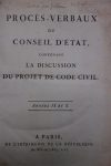 LOCRÉ (Jean Guillaume). PROCÈS - VERBAUX DU CONSEIL D'ÉTAT, CONTENANT LA DISCUSSION DU PROJET DE CODE CIVIL. PARIS, DE L'IMPRIMERIE DE LA RÉPUBLIQUE, 1804 - 1804. 5 volumes, in-4, de (1) f., 379 pp., (1) f., (2) ff., 1 f. bl. - 829 pp., (1) f., 1 f. bl. - (1) f., 530 pp. - (2) ff., 452 pp., (1) f. - (2) ff., 382 pp., pleines reliures de l'époque en basane mouchetée. Dos lisses cloisonnés, fleuronnés et dorés portant les titres dorés., tranches jaunes. Petits accrocs ou usures légères à quelques coiffes. Bel exemplaire.