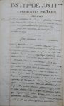 MANUSCRIT. INSTITUTS DE JUSTINIEN COMMENTÉS PAR MR JULIEN. MANUSCRIT, s. d., XVIIIe siècle (après 1737). Un volume, in-4, de (1) f., 23 pp., (3) ff. bl., 464 pp., (54) ff. bl., (26) ff. de tables, (8) ff. bl., (2) ff. de table des titres, pleine reliure de l'époque en basane mouchetée. Dos à 5 nerfs portant le titre manuscrit, tranches rouges. Bon exemplaire.