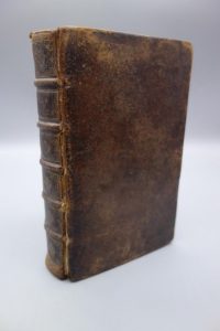Un volume, in-8, de (39) ff., 646 pp., pleine reliure ancienne en veau brun. Dos à 5 nerfs cloisonnés et fleuronnés portant une pièce de titre en maroquin brun, roulette dorée sur les coupes, tranches rouges. Mors fendus, galeries sur quelques cahiers au tout début du volume.