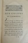 Cet ouvrage, censuré, est fort rare. «les ingrats colons firent périr l'auteur dans un cachot, parce qu'il fut soupçonné d'affection pour les Mulâtres et Nègres libres, avoir écrit: L'intérêt et la sûreté veulent que nous accablions les Noirs d'un si grand mépris que quiconque en descend jusqu'à la sixième génération, soit couvert d'une tache ineffaçable». Bon exemplaire.