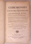 Ouvrage monumental traitant à égalité des différentes religions du monde et transformant ainsi durablement la perception du phénomène religieux, en particulier par le comparatisme.Reliures frottées avec manques de cuir sur les plats et coiffes, importantes épidermures sur les plats, coins très émoussés, petits manques de papier en marge aux pl. 135, 138 et 139 du t. II et à la gravure XXXIII du t. IV, mouillure sur une cinquantaine de page du tome 4, ne nuisant ni au texte ni à aux gravures.