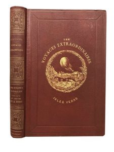 Grand in-8° double, cartonnage personnalisé de l'éditeur en pleine percaline à gros grains de couleur caramel. J. Hetzel Éditeur doré en pied du dos. Lenègre relieur (à froid sur les deux plats). Tranches dorées. Gardes bleues gris. Pour “5 semaines”, sans date, sans la faute de chiffrage à la page 181 et 182-
