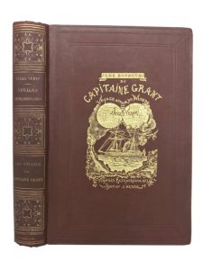 J. Hetzel Éditeur, sans date (1868). Grand in-8° triple, cartonnage personnalisé de l'éditeur en pleine percaline chocolat à toile croisillonée portant les mentions «Les Enfants/du capitaine Grant/Voyage autour du Monde/par/Jules Verne/Les Voyages Extraordinaires/Edition J. Hetzel» en couverture.