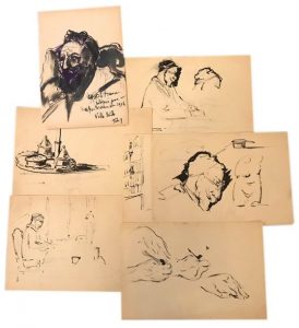 Le premier dessin étant un aperçu de l'ensemble, chacun des autres représentant un détail de l'ensemble, les mains de l'auteur, son profil, le côté de sa bibliothèque, un encrier. Chacun 16,5 x 11 cm, daté du 21 juin 1913 au crayon à papier et à l'encre.