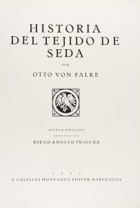 .1922. LIBRO: .(ARTE). .FALKE, OTTO VON:. .HISTORIA DEL TEJIDO DE SEDA.. Traducción por Diego Angulo Íñiguez. Barcelona: V. Casellas Moncanut Editor, 1922. Folio. 44 p.+ X láminas en color. 126 láminas con 526 figuras en negro. Encuadernación...