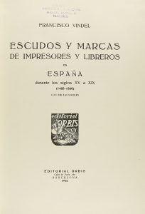 .1942.. LIBRO: .(BIBLIOFILIA). .VINDEL, FRANCISCO:. .ESCUDOS Y MARCAS DE IMPRESORES Y LIBREROS EN ESPAÑA DURANTE LOS SIGLOS XV A XIX (1485-1850).. Barcelona: Editorial Orbis, 1942. 4º mayor. XXIII-636 p.+ 1 h. 818 ilustraciones facsímiles....