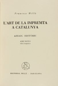 .1949. LIBRO: .(BIBLIOFILIA). .MILLÀ, FRANCESC: .L´ART DE LA IMPREMTA A CATALUNYA. ASSAIG HISTÒRIC. Barcelona: Editorial Millà, 1949. 8º. 115 p. Frontispicio. Facsímiles de portadas de libros antiguos impresos en Cataluña. Enc. en...