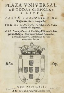 .1615. LIBRO: .(CIENCIAS). .SUAREZ DE FIGUEROA, CHRISTOVAL: .PLAZA UNIVERSAL DE TODAS LAS CIENCIAS Y ARTES, PARTE TRADUCIDA DE TOSCANO Y PARTE COMPUESTA POR EL DOCTOR... Madrid: Por Luis Sanchez, 1615. 8º mayor. 8 h. + 368 fol. Portada y...