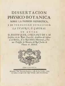 .1763. LIBRO: .(BOTANICA). .QUER, JOSEPH: .DISSERTACION PHYSICO-BOTANICA SOBRE LA PASSION NEPHRITICA, Y SU VERDADERO ESPECIFICO, la uva-ursi, ò gayubas. Madrid: Por Joachin Ibarra, 1763. 4º mayor. 3 h. + 56 p. y 1 lám. grabada y coloreada,...