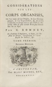 .1768. LIBRO: .(CIENCIAS). .BONNET, C.: .CONSIDÉRATIONS SUR LES CORPS ORGANISÉS, OÙ L´ON TRAITE DE LEUR ORIGINE, DE LEUR DÉVELOPEMENT, DE LEUR RÉPRODUCTION... Amsterdam: Chez Marc Michel Rey, 1768. 8º mayor. I: LX + 234 p. [Sigue:] ....