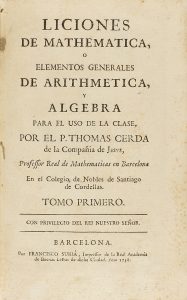 .1758. LIBRO: .(MATEMÁTICAS). .CERDA, THOMAS: .LICIONES DE MATHEMATICA O ELEMENTOS DE ARITHMETICA Y ALGEBRA ... Barcelona: Imp. de Francisco Surià, 1758. 2 vol. en 8º. I: 7 h. + 316 p. Frontis grabado por F. Boix. II: 2 h. + 237 p. + 1 h....