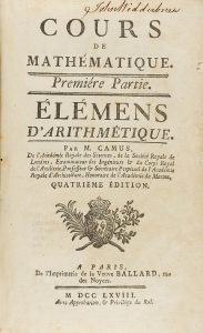 .1766-1769. LIBRO: .(MATEMÁTICAS). .CAMUS, M.: .COUS DE MATHEMATIQUES. 4 VOL. Paris: Imp. Ballard; Durand; Prault, 1766-1769. 4 vol. en 8º mayor. I: Prémiere partie. Élémens d´Arithmétique. VIII + 2 h. + 480 p. + 1 lám. plegada. II:...