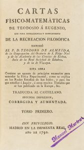 .1792.. LIBRO: .(CIENCIAS).. .ALMEIDA, TEODORO DE:. .CARTAS FÍSICO-MATEMÁTICAS de Teodosio á Eugenio, que para inteligencia y complemento de la recreación filosófica escribió… Tomo I.. Madrid: En la Imprenta Real, 1792. 8º: 4 h. + 270 p. +...