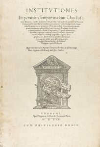 .1545. LIBRO: .(DERECHO). .INSTITUTIONES IMPERATORIS SEMPER MAXIMI DIUI IUSTINIANI ELEMENTA CIVILIS... Ludugni: Apud Hugonem Aemonis a Porta, 1545. Portada + 5 h. (de 6 h.) + 300 p. Folio mayor. Grabado xilográfico en portada. Bellas capitales y...