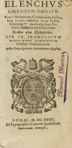 .1632. LIBRO: .(HUMANIDADES). .MAGDALENUM CAPIFERREUM, FRANCISCUM: .ELENCHUS LIBRORUM OMNIUM TUM TRIDENTINO, CLEMENTINOQ. INDICE, CUM IN ALIIS OMNIBUS SACRAE INDICIS... Romae: Typ. Camerae Apostolicae, 1632. 8º menor. Portada con grabado...