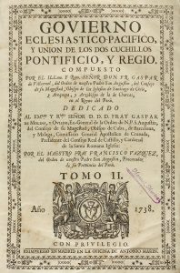 .1738. LIBRO: .(DERECHO CANÓNICO). .VILLARROEL, GASPAR DE: .GOVIERNO ECLESIASTICO-PACIFICO, Y UNION DE LOS DOS CUCHILLOS PONTIFICIO, Y REGIO. TOMO II. Madrid: Antonio Marin, 1738. 4º mayor. Portada en orla y con grabado xilográfico, 6 h. +...