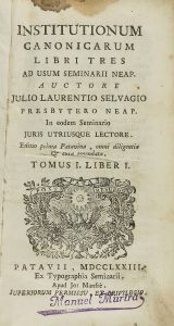 .1773. LIBRO: .(DERECHO CANÓNICO). .LAURENTIO SELVAGIO, JULIO: .INSTITUTIONUM CANONICARUM [...] TOMUS I. Patavii [Pádua]: Typ. Seminarii apud Jo: Manfre, 1773. 8º menor. Grabado tipográfico en la portada, XII + 478 p. Cabeceras y...