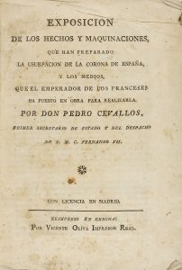 .1808 ca. FOLLETO: .(GUERRA INDEPENDENCIA). .CEVALLOS, PEDRO: .EXPOSICIÓN DE LOS HECHOS Y MAQUINACIONES, que han preparado la usurpación de la Corona de España... Gerona: Vicente Oliva Impresor Real, 8º mayor. 70 p. Ténue cerco de...
