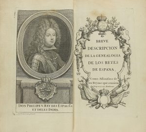 .s. XVIII. LIBRO: .(HISTORIA-GENEALOGÍA). .BREVE DESCRIPCIÓN DE LA GENEALOGIA DE LOS REYES DE ESPAÑA, como assimismo de los Reynos que contiene. Amberes: S. Imp., s.a. Frontis + 186 p. + 2 lám. Portada con orla Frontis de Simonneau; estado y...