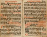 fol. I original; el recto de este folio, que contenía la portada y el inicio del texto, ha sido restituido con un facsímil manuscrito antiguo, con algún error de copia («breuarijs» por «breuiarijs», v.g.); en cambio, falta el texto correspondiente al verso (fol. Iv), con laguna desde el final de la «Lectio prima» hasta el inicio de la segunda lección del oficio «de expectatione beate Virginis». Escrito a renglón seguido. 24 líneas, excepto fol. Ir, de 21. Portada con orla tipográfica. Capitales xilográficas decoradas. Iniciales en negro y rojo. Encuadernación en pergamino que situamos en el s. XVIII, momento en el que con toda probabilidad fue añadido el facsímil de fol. I. Leves manchas de humedad y algún agujero que no afectan a la lectura. Ejemplar de una edición rarísima de las prensas zaragozanas de Diego Hernández. Juan M. Sánchez ya se refería a la obra como «opúsculo extremadamente raro» y la describía a partir de un ejemplar del convento de las Descalzas Reales de Madrid (Bibliografía aragonesa del siglo XVI, 1913-1914, I, nº 266), hoy en la Biblioteca Real. El proyecto Iberian Books (IB 5167) localiza otro ejemplar en Tempe, Arizona (Arizona State University Library). Palau 118814; no citado en CCPB. El impresor de origen sevillano Diego Hernández está documentado en Valencia entre 1534 y 1536. En 1544 contrae matrimonio con la impresora zaragozana Juana Millán, viuda del tipógrafo Pedro de Hardouyn, y pasa a regentar el negocio hasta su muerte (febrero de 1549). Durante el breve período de actividad de Hernández en Zaragoza, en sus prensas se publican entre 1545 y 1548 una docena de títulos aproximadamente, entre ellos éxitos editoriales (Nebrija, Celestina, etc.), tratados morales y la colección litúrgica que presentamos.