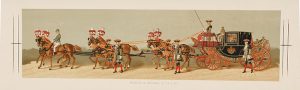 Madrid, 1883. Impresor: A. Foruny. 18 x 61 cm. Conserva la carpeta cartonné. Portada con escudo de la Corona Real. 48 cromolitografías sueltas, algunas menores pero sin faltas. Faltan 15 cromolitografías del total (63). Buen estado de conservación. Obra que recoge detalles de la comitiva, carros y regimientos reales en ocasión de la boda del monarca Alfonso XII con María Cristina de Austria el 1879. Interesante por los uniformes y carruajes, iluminados y plateados. V. Sabater pintó, Manuel Gimenez, cromolitº.