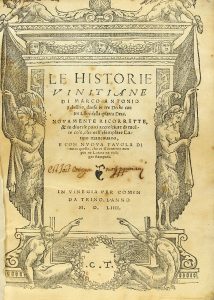 tostado y puntos de óxido en algunas p., pequeña pérdida en la p. 82, antigua mancha de tinta en el margen derecho de la segunda mitad de la obra. Ilustr. con orla arquitectónica grabada en la portada, capitales. Enc. en pleno pergamino de época, semidesprendida, lomera rotulada. Esta es la primera edición traducida al italiano, realizada por Dolce. Este clásico apareció por primera vez en Venecia en 1487. Sabellico Marcantonio Coccio, conocido como Sabellico fue el primer oficial veneciano historiador que basó su trabajo en la Crónica de Dandolo, pero en la forma de analizar imitó la crónica de Bruni Florentine. Anotación de antiguo poseedor. CCPB 853838-7.