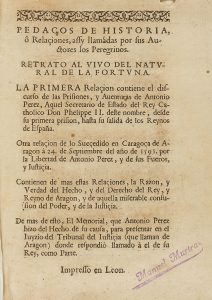 A-3F4. Falta la 3ª hoja (A3). Portada con pequeña cabecera xilográfica y mínima falta de papel en el margen superior que no afecta texto. Capitales. Texto con apostillas marginales, algunas p. tostadas. Tenue cerco de humedad intermitente hasta la p. 48. Enc. en pasta española, lomera cuajada con algún taladro, tejuelo, cortes pintados. Sello húmedo de anterior poseedor. Palau 219033: ´... el impresor anónimo advierte que ésta es la segunda tirada que lanza en circulación de las Relaciones... Obsérvase la frase miserable: confusión del poder y de la justicia, en ella se encierra el primer atisbo de lo que luego Montesquieu desarrollará en su teoria de la separación de poderes. El autor disimula su nombre bajo el seudónimo de Raphael Peregrino y en carta dirigida al impresor o editor, dice que le ayudó en la tarea su hermano Azarias´. CCPB 20331-9.