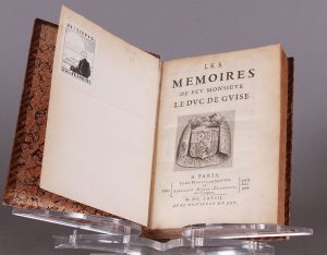Paris, chez Edme Martin, et Sébastien Mabre-Cramoisy, 1668.Grand in-8 (25 x 17,5), demi-veau brun postérieur (dos frotté, coiffe sup. fragilisée), dos à 5 nerfs, les plats recouverts de papier à la cuve, (8)-795 p. Vignette aux armes de Guise au titre. Ex-libris gravé Henri Joseph Francotte. De la bibliothèque de G. Francotte (n° 164 de la vente de cette bibliothèque, le 13 décembre 1945). Edition originale, comme le souligne le catalogue Wahle de 1981 (l’édition Elzevier, de la même année, était postérieure; Brunet, II, 1827). A ne pas confondre avec Henri le Balafré, le présent «mémorialiste» Henri II de Lorraine (1614-1664) dirigea les expéditions contre Naples et finit grand chambellan de Louis XIII. Pour apocryphe qu’il soit, l’ouvrage présente néanmoins un intérêt historique.
