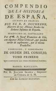 .1775. LIBRO: .(HISTORIA). .DUCHESNE: .COMPENDIO DE LA HSITORIA DE ESPAÑA. Madrid: Imp. Ibarra, 1775. 2 vol. 8º menor. I: 1 h. + XLVI p. + 364 p. y un mapa plegado. II: 1 h. + 469 p. Dos vol. enc. en pasta española, nervios, doble tejuelo,...