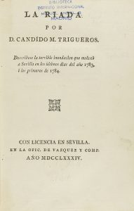 .1784.. LIBRO: .(HISTORIA-SEVILLA). .TRIGUEROS, CANDIDO M.[ARIA]:. .LA RIADA. DESCRIBESE LA TERRIBLE INUNDACION QUE MOLESTÒ A SEVILLA EN LOS ÙLTIMOS DIAS DEL AÑO 1783, I LOS PRIMEROS DE 1784.. Sevilla: en la Ofic. de Vazquez y Comp., 1784. 8º...
