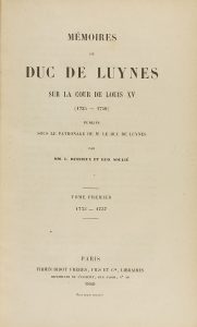 enc. en media piel, doble tejuelo, nervios. Muy rara completa, como esta. Testimonio del duque de Luynes de su vida en la corte de Luis XV, donde vivió el esplendor desmesurado de una corte que vivía ajena del pueblo y sus problemas.