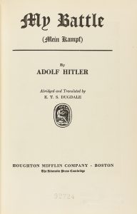 .[1933].. LIBRO: .(HISTORIA). .HITLER, ADOLF:. .MY BATTLE ( MEIN KAMPF).. Boston [Cambridge, Massachusetts]:Houghton Mifflin Company [The Riverside Press], [1933]. 8º mayor. Lámina con fotografia (Der Fuehrer), VIII-297 páginas. Tela editorial...