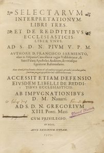 .1573. LIBRO: .(RELIGIÓN). .SARMIENTO, FRANCISCO: .SELECTARUM INTERPRETATIONUM. LIBRI TRES. ET DE REDDITIBUS ECCLESIASTICIS. LIBER UNUS... Burgis: Apud Philippum Iuntam, 1573. Folio. 130 fol. + 10 h. + 68 fol. + 4 h. + 71 p. Texto a dos...