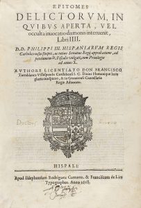 .1618. LIBRO: .(MAGIA). .TORREBLANCA VILLALPANDO, FRANCISCO: .EPITOMES DELICTORUM, IN QUIBUS APERTA , VEL OCCULTA INVOCATIO DAEMONIS INTERUENIT. Hispali [Sevilla]: Apud Ildephonsum Rodriguez Gamarra, & Franciscum de Lira Typographos, 1618....