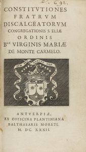 .1632. LIBRO: .(ÓRDENES RELIGIOSAS). .CONSTITUTIONES FRATRUM DISCALCEATORUM CONGREGATIONIS S. ELIAE ORDINIS Bmae VIRGINIS MARIAE DE MONTE CARMELO. Antuerpiae: Officina Plantiniana Balthasaris Moreti, 1632. 8º. 263 + 30 p. + 1 h. con escudo...