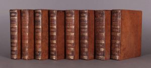 Paris, chez la Veuve Estienne, Libraire, 1740. / Paris, chez la Veuve Estienne, Libraire, 1740.2 vol. et 6 vol. (numérotation continue) in-4 (26,5 x 19,5), plein veau raciné de l’époque, dos lisse orné de filets et fleurons, tranches jaunes, (24)-lxxvi-684 p.-(8) p. (table, approbation et privilège, errata), et 676 p.-(31) p. (tables), pour le Traité des études; et lxiv-574 p.-(9) p. (table, approbation et privilège, errata), 715 p.-(8) p. (table et errata), 831 p.-(8) p. (table et errata), 712 p.-(8) p. (table), 852 p.-(12) p. (table et errata), et 816 p. (comprenant les tables chronologique et des matières). L’Histoire ancienne est illustrée de 29 vignettes gravées par Le Bas, mais l’ouvrage ne comporte pas les 14 cartes. Petits défauts à la reliure, sinon bel exemplaire, intérieur frais. Un cahier lég. relâché au début du deuxième tome de l’histoire ancienne. Ces deux ouvrages de Rollin (1661-1741), ancien recteur de l’Université de Paris, sont présentés ici en édition originale.