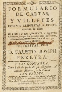 .1728. LIBRO: .(HUMANIDADES). .PEREYRA, FAUSTO JOSEPH: .FORMULARIO DE CARTAS Y VILLETES, CON SUS RESPUESTAS A CONTINUACION DE ELLAS. Madrid: Gabriel del Barrio, 1728. 8º mayor. 16 h. + 338 p. + 4 h. Hojas ligeramente tostadas. Enc. en media...