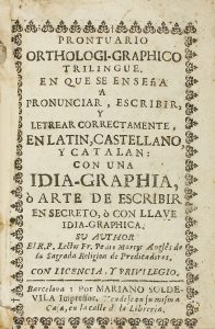 .1742 ca. LIBRO: .(ORTOGRAFÍA). .ANGLÉS, PEDRO MÁRTIR: .PRONTUARIO ORTHOLOGI-GRAPHICO TRILINGUE en que se enseña a pronunciar y letrear correctamente en latin, castellano y catalan... Barcelona: Mariano Soldevia, 1742 ca (en texto)....