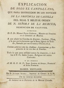 .1779. LIBRO: .(MÚSICA). .PEREZ CALDERON, MANUEL: .EXPLICACION DE SOLO EL CANTO-LLANO QUE PARA INSTRUCCION DE LOS NOVICIOS DE LA PROVINCIA DE CASTILLA DEL REAL Y MILITAR ORDEN DE N. SEÑORA DE LA MERCED, REDENCION DE CAUTIVOS, COMPUSO......