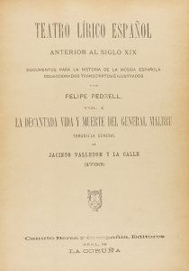 Editores,1897-1898. 5 tomos en 1 vol. en 4º mayor. I: LA DECANTADA VIDA Y MUERTE DEL GENERAL MALBRU. Tonadilla General de JACINTO VALLEDOR Y LA CALLE (1785). XII p. + 40 p. con música notada. Pequeña restauración en portada. II: XXXV p. + 1 h. y 48 p. con música notada. III: XXXII p. + 1 h. + 51 p. con música notada. IV y V: XXIX p. + 1 h. + 78 p. con las partiruras. Felip Pedrell además de músico y compositor, es sin duda el musicólogo más relevante de su tiempo. Sentó las bases de la musicología moderna y recuperó las características sonoras de la música española. Algunos de sus discípulos directos son Isaac Albéniz, Enrique Granados, Cristòfor Taltabull, Pedro Blanco, José María Peris Polo, Joaquín Turina y Manuel de Falla.