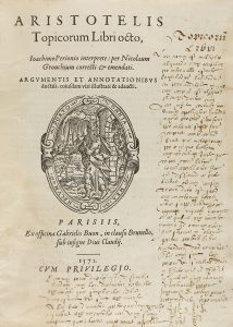 .1571. LIBRO: .(CLÁSICOS). .ARISTOTELES: .ARISTOTELIS TOPICORUM LIBRI OCTO. Ioachino Perionio interprete per Nicolaum Grouchium correcti & emendati. Argumentis et annotationibus... Parisiis: Exofficina Gabrielis Buon, 1571. 8º mayor. 100...