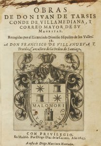 .1643. LIBRO: .(LITERATURA). .TARSIS, IUAN DE:. .OBRAS DE... CONDE DE VILLAMEDIANA, Y CORREO MAYOR DE SU MAGESTAD. Recogidas por el licenciado Dionisio Hipolito de los Valles... Madrid: Diego Díaz de la Carrera, 1643. 8º mayor. 8 h. + 437...