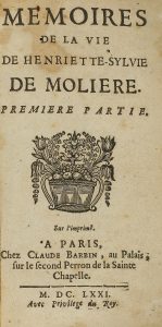 .1671-1672. LIBRO: .(LITERATURA FRANCESA). .VILLEDIEU, MARIE-CATHERINE-HORTENSE DE: .MEMOIRES DE LA VIE DE HENRIETTE-SYLVIE DE MOLIERE. 4 partes (de 6). Paris: Chez C. Barbin, 1671-1672. 8º menor. 3 h. + 64 p. + 1 h. + 84 p. + 148 p. La Parte...