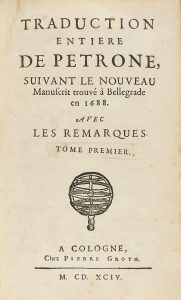+ 551. Cabeceras xilografiadas. Texto con apostillas marginales. Algún dibujo a lápiz o en tinta de anterior poseedor en las guardas. Dos vol. enc. en pasta española, hilos dorados, cejas, nervios, doble tejuelo, rozada, cortes jaspeados. Primera traducción al francés del Satiricón. Hasta ese momento el texto de Petronio había estado incompleto. El descubrimiento de ciertos manuscritos en Belgrado en 1688, completaron y facilitaron la comprensión de la obra, por eso esta versión se constituye en el texto básico.