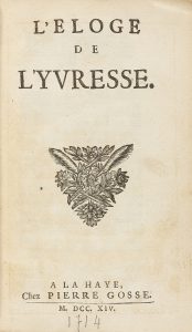 .1714. LIBRO: .(LITERATURA). .[SALLENGRE, ALBERT HENRI DE:]. .L´ELOGE DE L´YVRESSE. La Haye: Chez Pierre Gosse, 1714. 8º menor. 4 h. + 216 p. Frontis alegórico grabado con una alegoría de Baco en su liturgia etílica. Enc. plena piel de becerro...