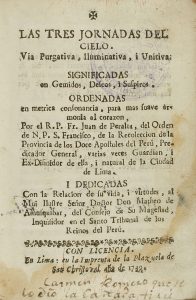 .1749. LIBRO: .(LITERATURA CASTELLANA). .PERALTA, JUAN DE: .LAS TRES JORNADAS DEL CIELO. Via pugativa, iluminativa, i unitiva significadas en gemidos, deseos i suspiros ordenadas... Lima: Imp. de la plazuela de San Christoval, 1749. 8º...